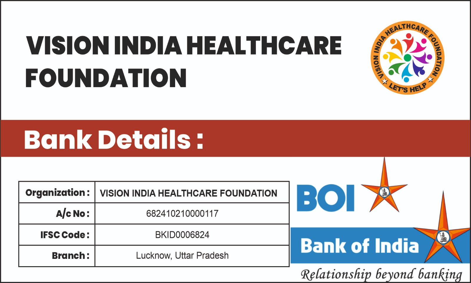 objectives can contribute in form of Cheque/ Demand Draft/ Cash in favour of VISION INDIA HEALTHCARE FOUNDATION.